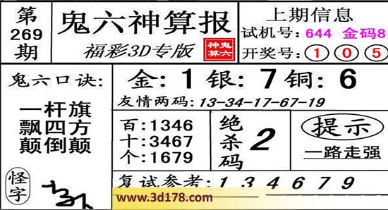 3d第16269期鬼六神算报为您推荐鬼六口诀: