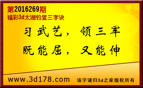 第16269太湖字谜解太湖钓叟三字诀:福彩3d第2016269太湖图库解析:习武艺:学习武艺的事情,解5有4;领三军:带领三军打仗,看3防1;既能屈:在失意时能忍耐,有4解8;又能伸:在得志时能施展抱负,解1看7;六码复式:134578精选10注:134 345 457 357 358 459 268 367 018 2693d太湖图库由3D之家3D图库频道原创,仅供彩民参考,温馨提供。