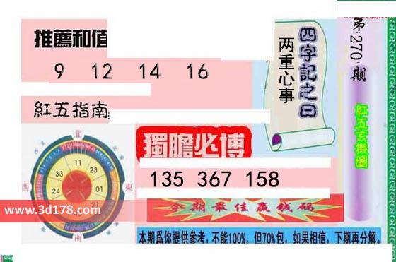 3d之家红五图库第16270期福彩3d红五图为您推荐:福彩3d第2016270期红五玄机图详细内容:推荐和值:9 12 14 16独胆必博:135 367 158四字记之曰:两重心事该红五图库由3d之家3d图库频道原创,仅供彩民参考,温馨提供。