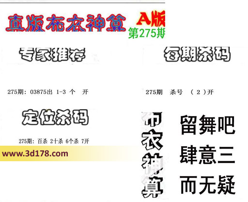 3d之家布衣图库之布衣神算图第2016275期详解:专家推荐:
