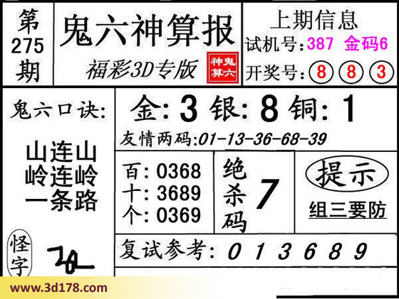 3d第16275期鬼六神算报为您推荐鬼六口诀: