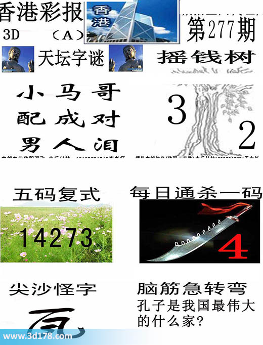 3d之家3d香港彩报第16277期摇钱树:本期3d香港彩报图详情如下:天坛字谜:小马哥,配成对,男人泪。摇钱树:23五码复式:12347每日通杀一码:4脑筋急转筋:孔子是我国最伟大的什么家?该香港彩报由3d之家3d图库频道原创,仅供彩民参考,温馨提供。