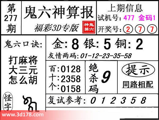 3d第16277期鬼六神算报为您推荐鬼六口诀:本期3d鬼六图库精解如下:鬼六口诀:打麻将,大三元,怎么胡复式参考:012358金胆:8,银胆:5,铜胆:2定位复式:百位:0128十位:2358个位:0158绝杀码:9友情两码:01-12-23-35-58该鬼六图库由3d之家3d图库频道原创,仅供彩民参考,温馨提供。