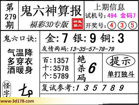 3d第16279期鬼六神算报为您推荐鬼六口诀: