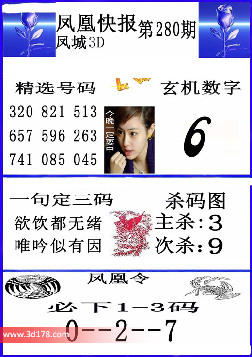 福彩3d凤凰快报图第16280期精选号码推荐: