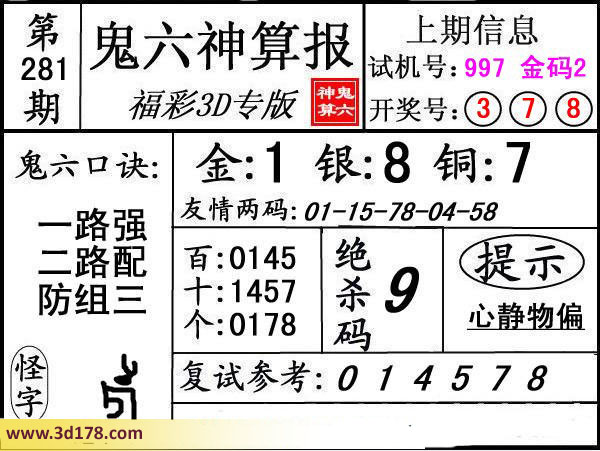 个位:0178绝杀码:9友情两码:01-15-78-04-58该鬼六图库由3d之家3d图库频道原创,仅供彩民参考,温馨提供。