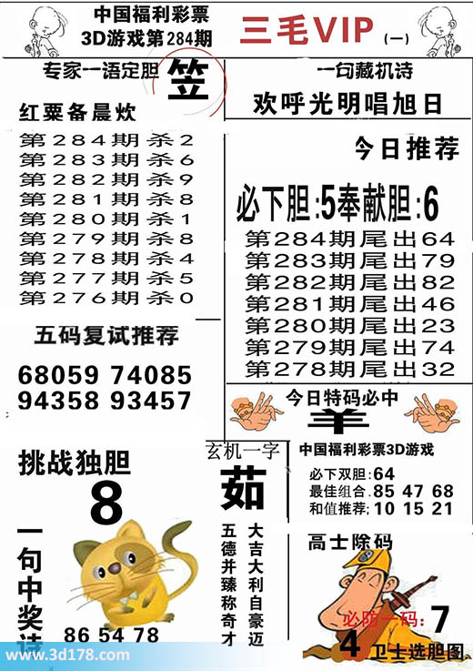 福彩3d第2016284期三毛VIP:3d第2016284期三毛VIP详解:一句藏机诗:欢呼光明唱旭日第2016284期杀一码推荐:2必下双胆:64 挑战独胆:8五码复式推荐:68059 74085 94358 93457今日特码必中:羊最佳组合:85 47 68和值推荐:10 15 21玄机一字:茹一句中奖诗:五德并臻称奇才,大吉大利自豪迈。该三毛玄机解码图由3d之家3d图库频道原创,仅供彩民参考,温馨提供。