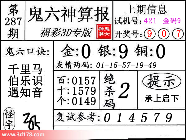 3d第16287期鬼六神算报为您推荐鬼六口诀: