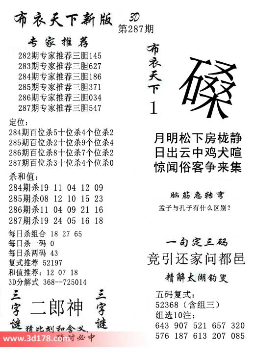 福彩3d第2016287期福彩3d布衣天下新版: