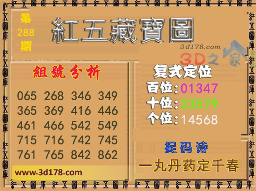 3d之家3d红五藏宝图第2016288期为您推荐复式定位、捉码诗以及组号分析: