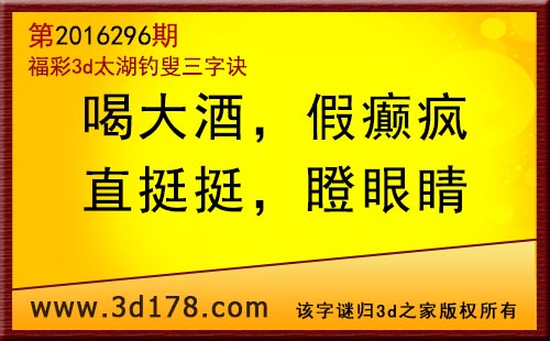 福彩3d第2016296太湖图库解析:喝大酒:酒喝得太多了,一下就喝高了,最高是9;