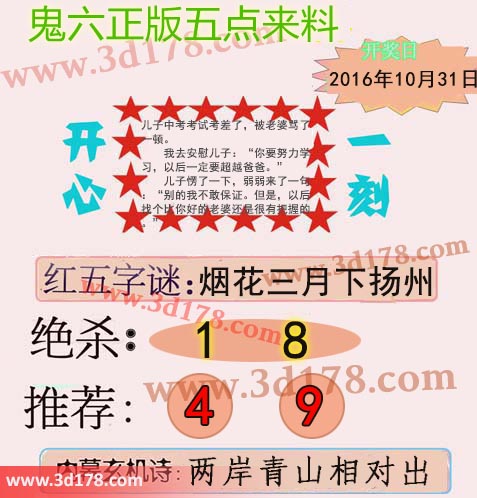 福彩第16298期3d鬼六五点来料图详解:3d鬼六图库第16298期鬼六正版五点来料图:字谜:烟花三月下扬州绝杀:1 8两胆码推荐:4 9内幕玄机诗:两岸青山相对出该鬼六图库由3d之家3d图库频道原创,仅供彩民参考,温馨提供。
