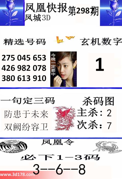 福彩3d凤凰快报图第16298期精选号码推荐:3d第2016298期凤凰快报内容解析:玄机数字:1精选号码:275 045 653 426 982 078 380 613 910一句定三码:防患于未来,双阙纷容卫杀码图:主杀:2 次杀:7凤凰令:必下1-3码,3--6--8该凤凰快报图库由3d之家3d图库频道原创,仅供彩民参考,温馨提供。