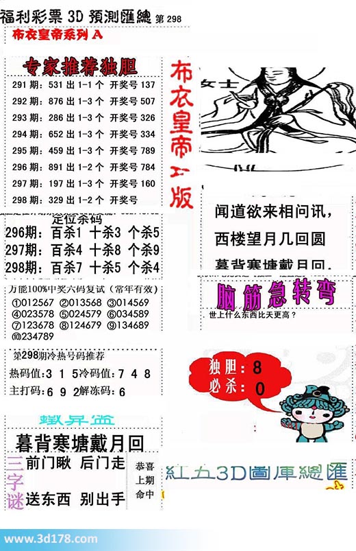 福彩3d第2016298期布衣皇帝A版布衣专家独家推荐:3d之家布衣皇帝第298期详解:专家推荐独胆:298期:329 出1-3个 开奖号定位杀码:百位杀 7 十位杀 5 个位杀 4第298期冷热号码推荐:热码值:3 1 5冷码值:7 4 8主打码:6 9 2解冻码:6天机诗:闻道欲来相问讯,西楼望月几回圆,暮背寒塘戴月回。铁算盘:暮背寒塘戴月回。三字谜:前门瞅,后门走。送东西,别出手。该布衣图库由3d之家3d图库频道原创,仅供彩民参考,温馨提供。