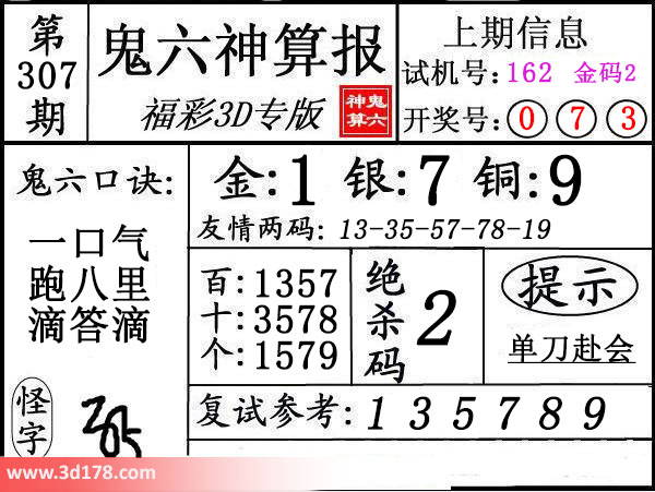 3d第16307期鬼六神算报为您推荐鬼六口诀: