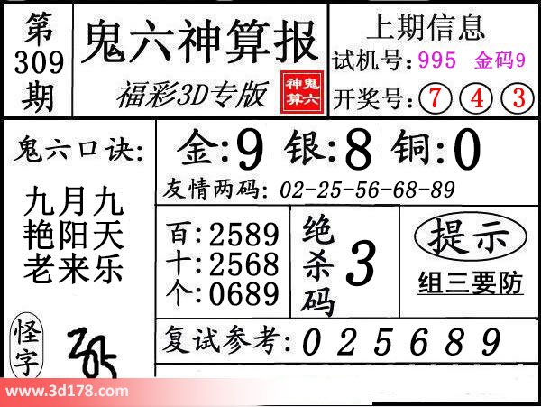 3d第16309期鬼六神算报为您推荐鬼六口诀: