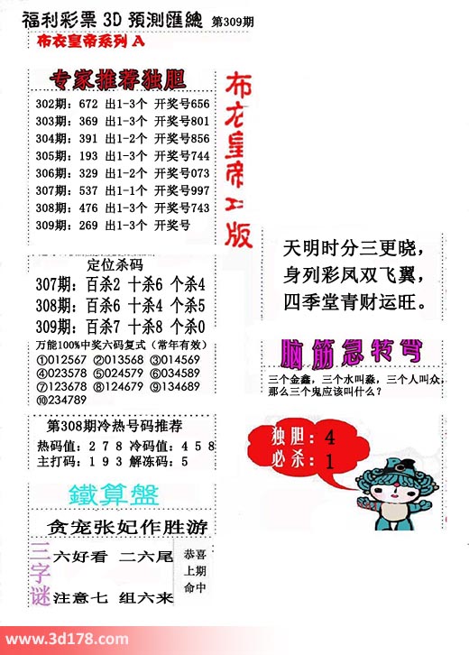 福彩3d第2016309期布衣皇帝A版布衣专家独家推荐: