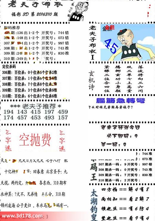 福彩3d第2016310期老夫子布衣图详情:310期:349 出1-2个 开奖号:310期:百位杀6 十位杀1 个位杀8老夫子精选推荐:194 143 415 197 459 174 457 453 493 157老夫子预测今日必下胆9,杀一码0脑筋急转弯:什么时候先穿鞋再穿袜子?该布衣图库由3d之家3d图库频道原创,仅供彩民参考,温馨提供。