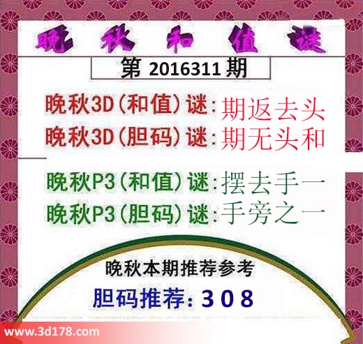 3d之家3d红五晚秋图第2016311期为您推荐分析:晚秋3D(和值)谜:期返去头