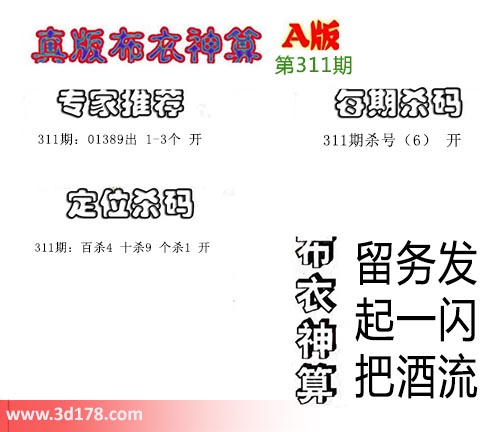 3d之家布衣图库之布衣神算图第2016311期详解:专家推荐: