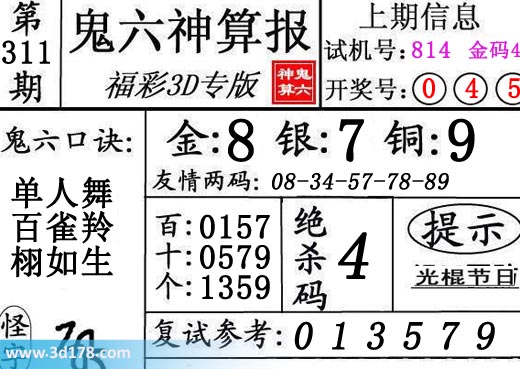 3d第16311期鬼六神算报为您推荐鬼六口诀: