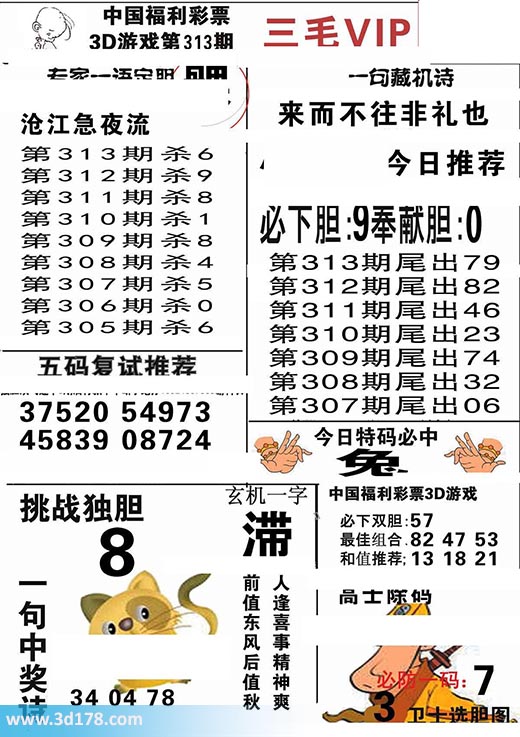 福彩3d第2016313期三毛VIP:3d第2016313期三毛VIP详解:一句藏机诗:来而不往非礼也第2016313期杀一码推荐:6必下双胆:57 挑战独胆:8五码复式推荐:37520 54973 45839 08724今日特码必中:兔最佳组合:82 47 53和值推荐:13 18 21玄机一字:滞一句中奖诗:人逢喜事精神爽,前值东风后值秋。该三毛玄机解码图由3d之家3d图库频道原创,仅供彩民参考,温馨提供。