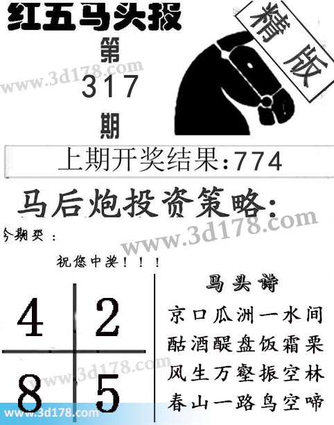 3d第2016317期红五马头报本期马头诗详解:上期开奖号码:774