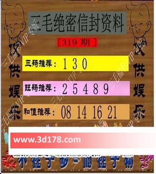 3d之家第2016319期三毛绝密信封资料图:福彩3d第319期三毛绝密信封资料图详解:三码推荐:013旺码推荐:24589和值推荐:8 14 16 21三毛图库由3d之家3d图库频道原创,仅供彩民参考,温馨提供。