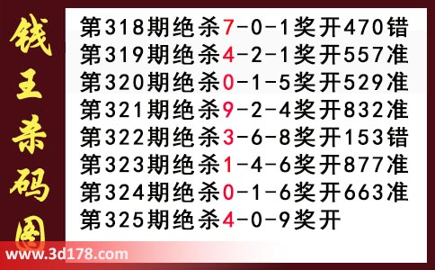 第2016325期3d钱王杀码图杀号推荐分析:近期3d钱王杀码具体详情:第318期绝杀7-0-1奖开470错第319期绝杀4-2-1奖开557准第320期绝杀0-1-5奖开529准第321期绝杀9-2-4奖开832准第322期绝杀3-6-8奖开153错第323期绝杀1-4-6奖开877准第324期绝杀0-1-6奖开663准第325期绝杀4-0-9奖开该钱王杀码图由3d之家3d图库频道原创,仅供彩民参考,温馨提供。