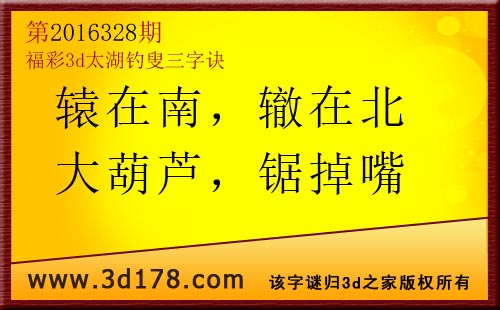 福彩第2016328期3d太湖字谜:辕在南,辙在北,大葫芦,锯掉嘴