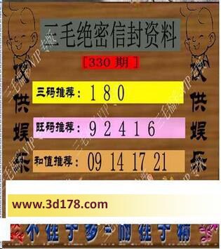 3d之家第2016330期三毛绝密信封资料图:福彩3d第330期三毛绝密信封资料图详解:三码推荐:180旺码推荐:12469和值推荐:09 14 17 21三毛图库由3d之家3d图库频道原创,仅供彩民参考,温馨提供。