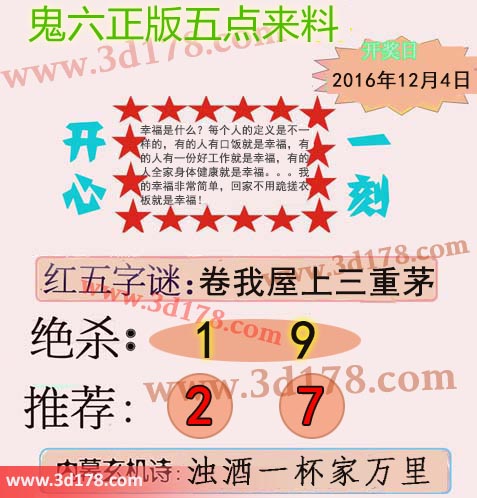 福彩3d第2016332期鬼六五点来料: