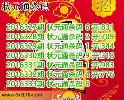 2016327期 状元通杀码 6 开:831