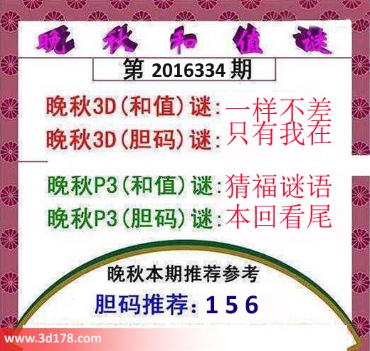 晚秋3D(和值)谜:一样不差