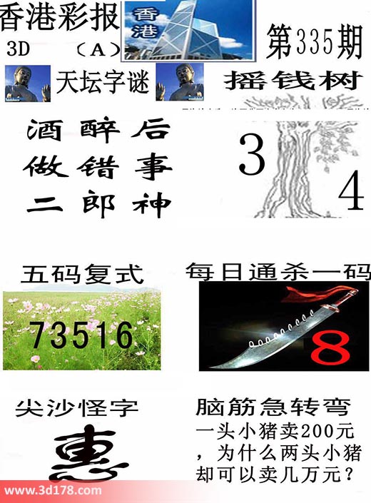 3d之家3d香港彩报第16335期摇钱树:本期3d香港彩报图详情如下:天坛字谜:酒醉后,做错事,二郎神。摇钱树:34五码复式:13567每日通杀一码:8脑筋急转筋:一头小猪卖200元,为什么两头小猪却可以卖几万元?该香港彩报由3d之家3d图库频道原创,仅供彩民参考,温馨提供。