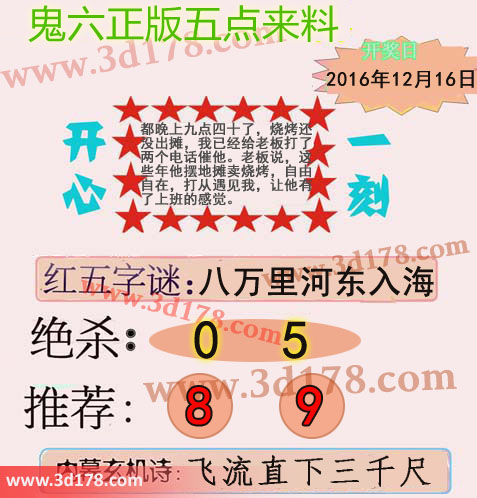 3d鬼六五点来料详解第2016344期:字谜:八万里河东入海绝杀:0 5两胆码推荐:8 9内幕玄机诗:飞流直下三千尺该鬼六图库由3d之家3d图库频道原创,仅供彩民参考,温馨提供。