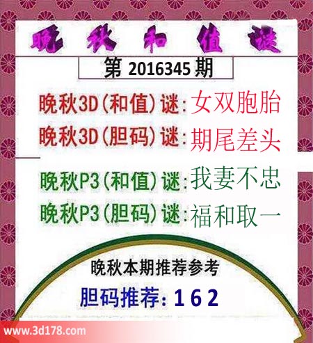 晚秋3D(和值)谜:女双胞胎