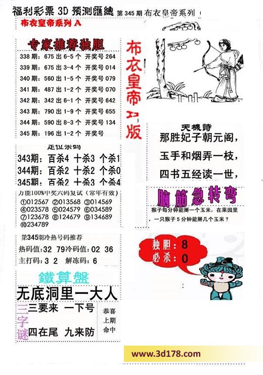 福彩3d第2016345期布衣皇帝A版布衣专家独家推荐: