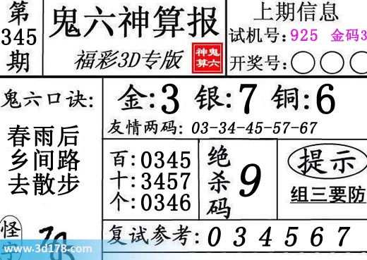 3d第16345期鬼六神算报为您推荐鬼六口诀:
