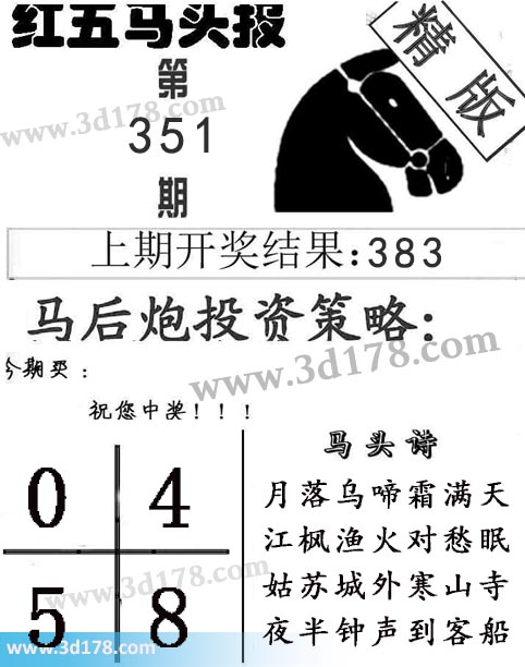福彩3d第2016351期红五马头报(精版)推荐:3d第2016351期红五马头报本期马头诗详解:上期开奖号码:383马头诗:月落乌啼霜满天,江枫渔火对愁眠。姑苏城外寒山寺,夜半钟声到客船。今期买:0458该红五图库由3d之家3d图库频道原创,仅供彩民参考,温馨提供。