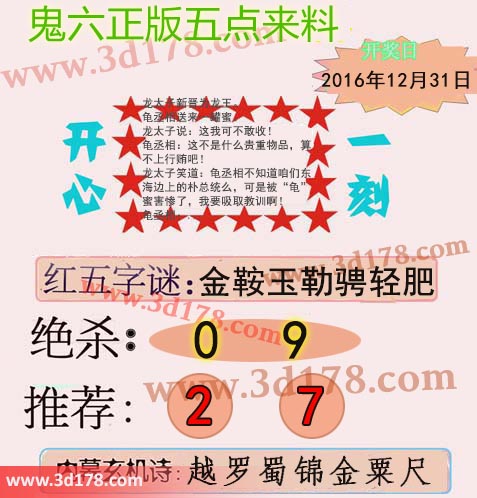 福彩3d第2016359期鬼六五点来料:3d鬼六五点来料详解第2016359期:字谜:金鞍玉勒骋轻肥绝杀:0 9两胆码推荐:2 7内幕玄机诗:越罗蜀锦金粟尺该鬼六图库由3d之家3d图库频道原创,仅供彩民参考,温馨提供。