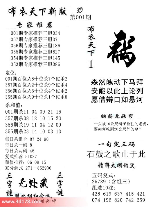 福彩3d第2017001期福彩3d布衣天下新版: