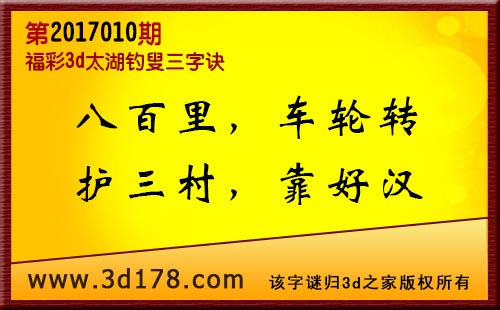 第17010期3d太湖字谜解太湖钓叟三字诀:福彩3d第2017010太湖图库解析:八百里:八百里的路,解8有6;车轮转:车轮子一直转,看0防4;护三村:要保护三个村子,解3防9;靠好汉:需要靠好汉们,有6看9;六码复式:034689精选10注:034 346 369 048 157 269 367 058 039 6893d太湖图库由3d之家3d图库频道原创,仅供彩民参考,温馨提供。
