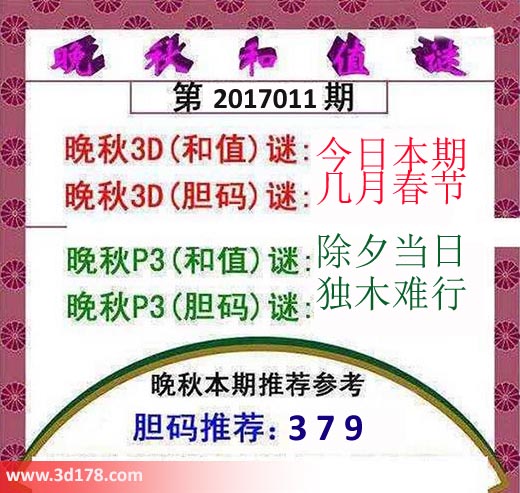 晚秋3D(胆码)谜:几月春节