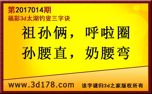 第17014期3d太湖字谜解太湖钓叟三字诀: