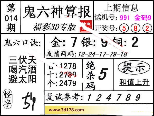 3d第17014期鬼六神算报为您推荐鬼六口诀: