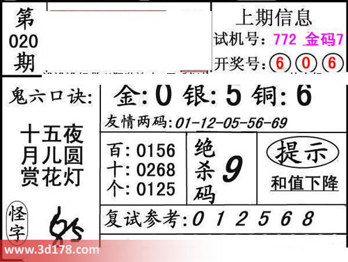 3d第17020期鬼六神算报为您推荐鬼六口诀: