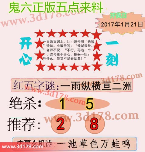 3d鬼六五点来料详解第2017021期:字谜:一雨纵横亘二洲