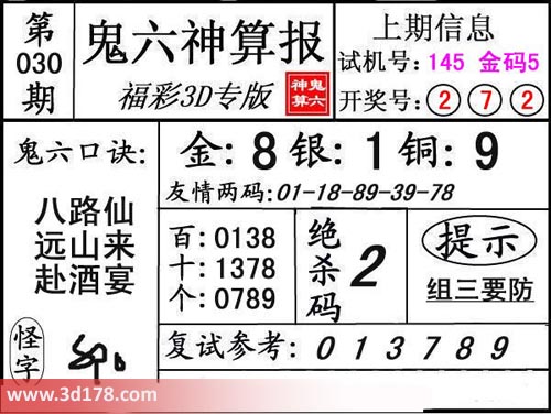 3d第17030期鬼六神算报为您推荐鬼六口诀: