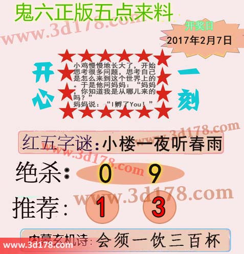 3d鬼六五点来料详解第2017031期:字谜:小楼一夜听春雨